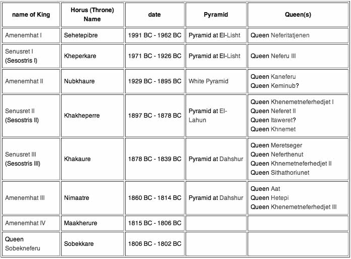 In the Turin King-list, the dynasty started with Amenemhat I and consisted of 8 kings who ruled for a total of 213 years, 1 month and 17 days. All kings listed in the Turin King-list are also attested by contemporary sources and monuments.
