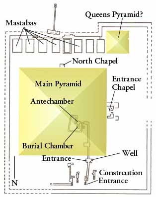 While the pyramid had been robbed in antiquity, it nevertheless took Petrie months to located the entrance to this pyramid. The reason is that for the first time, the builder's were more interested in security then religious tradition, and therefore hid the entry passage in the pavement of the pyramid courtyard near the east end of the pyramid's south side.