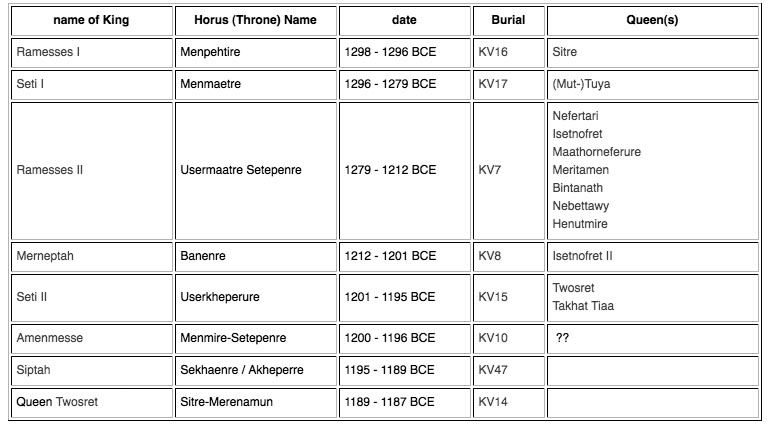 The Pharaohs of the 19th dynasty ruled for approximately one hundred and ten years: from ca 1298 to 1187 BCE. The dates and names in the table are taken from Dodson and Hilton. Many of the pharaohs were buried in the Valley of the Kings in Thebes (designated KV). More information can be found on the Theban Mapping Project website.