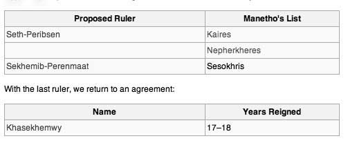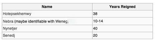 The name of Ninetjer's successor to the throne, Peribsen (Seth-Peribsen), unusually referencing the god Seth, is another piece of evidence indicating unrest. However, it is likely that Peribsen did not directly replace Ninetjer. It is likely that as many as two or more shadowy rulers (Weneg, Sened and Nubnefer) took the throne of perhaps a divided Egypt in the interim. However, most modern kings' lists do not reference all of them, and some list only one or two.