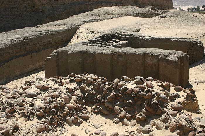 However, probably more impressive is a structure located in the desert about 1,000 yards from the tomb. Known as the Shunet el-Zebib (storehouse of the Dates), it was a huge rectangular structure measuring 123 x 64 meters (404 x 210 ft). The mudbrick walls of the structure, with their articulated palace facade, were as much as 5 meters (16 ft) thick and as high as 20 meters (66 ft). Incredibly, fragments of these mudbrick walls have survived for nearly 5,000 years.