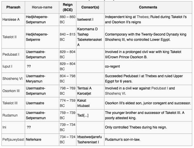 The Twenty-third Dynasty of ancient Egypt was a separate regime of Meshwesh Libyan kings, who ruled ancient Egypt. This dynasty is often considered part of the Third Intermediate Period. There is much debate surrounding this dynasty, which may have been situated at Herakleopolis Magna, Hermopolis Magna, and Thebes but monuments from their reign show that they controlled Upper Egypt in parallel with the Twenty-second dynasty of Egypt shortly before the death of Osorkon II. The known rulers, in the History of Egypt, for the Twenty-third Dynasty are as follows: