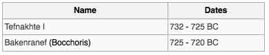 The Twenty-First, Twenty-Second, Twenty-Third, Twenty-Fourth and Twenty-Fifth Dynasties of ancient Egypt are often combined under the group title, Third Intermediate Period. The Twenty-Fourth Dynasty was a short-lived group of pharaohs who had their capital at Sais in the western Nile Delta. The known rulers, in the History of Egypt, for the Twenty-Fourth Dynasty are as follows: