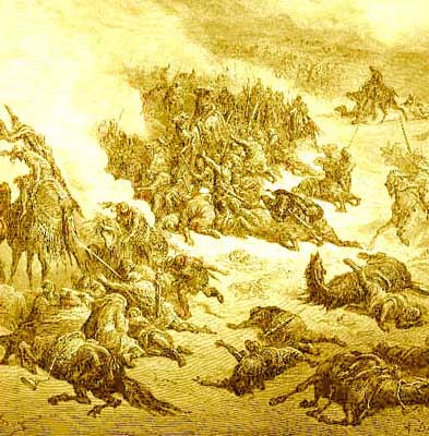 According to Herodotus (as later reported to him by the inhabitants of Siwa), after many days of struggle through the soft sand, the troops were resting one morning when calamity struck without warning. "As they were at their breakfast, a wind arose from the south, strong and deadly, bringing with it vast columns of whirling sand, which buried the troops and caused them utterly to disappear." Overwhelmed by the powerful sandstorm, men and animals alike were asphyxiated as they huddled together, gradually being enveloped in a sea of drift-sand.