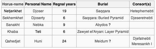 The Abydos King List gives: Nebka, Djoser, Teti, Sedjes, and Neferkare