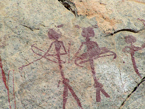 Petroglyphs from around the world depict early use of weapons. Cave art in Spain and France - dating from 10,000 to 5,000 BC - show men fighting with bow and arrows. As early as 6,000 BC African cave paintings show people armed with clubs. Much later wooden clubs were still used in Africa and the Pacific. Early axes were made of wood and stone. (Like the tomahawk of the Native Americans). However the sword was not a practical weapon until people had become skilled in making things from metal. In Australia Aborigines hurled large boomerangs at their enemies. However war boomerangs were not designed to come back. Aborigines also fought with spears. To protect themselves they carried a curved stick, which was held in the center. It was used to parry spears and boomerangs.