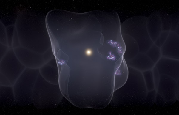 The Solar System floats in the middle of a peculiarly empty region of space. This region of low-density, high-temperature plasma, about 1,000 light-years across, is surrounded by a shell of cooler, denser neutral gas and dust. It's called the Local Bubble, and precisely how and why it came to exist, with the Solar System floating in the middle, has been a challenge to explain.