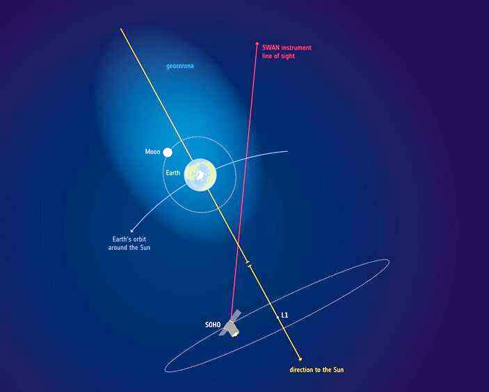 The gaseous layer that wraps around Earth reaches up to 630,000 kilometers away, or 50 times the diameter of our planet Where our atmosphere merges into outer space, there is a cloud of hydrogen atoms called the geocorona. One of the spacecraft instruments, SWAN, used its sensitive sensors to trace the hydrogen signature and precisely detect how far the very outskirts of the geocorona are. These observations could be done only at certain times of the year, when the Earth and its geocorona came into view for SWAN. For planets with hydrogen in their exospheres, water vapor is often seen closer to their surface. That is the case for Earth, Mars and Venus.