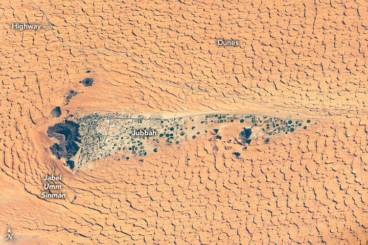 Long-sustained westerly winds shaped the dunes surrounding the Saudi Arabian oasis of Jubbah in this photograph shot by an astronaut from the International Space Station (ISS). Jubbah sits in the protective wind shadow of Jabel Umm Sinman, which roughly translates from Arabic as "two camel-hump mountain." The hard, black rock of the mountain disrupts wind flow and blocks dunes from forming on its lee side. The area around Jabel Umm Sinman has been at the center of significant climatic and anthropological shifts during the Holocene, a geologic term for the past 10,000 years.