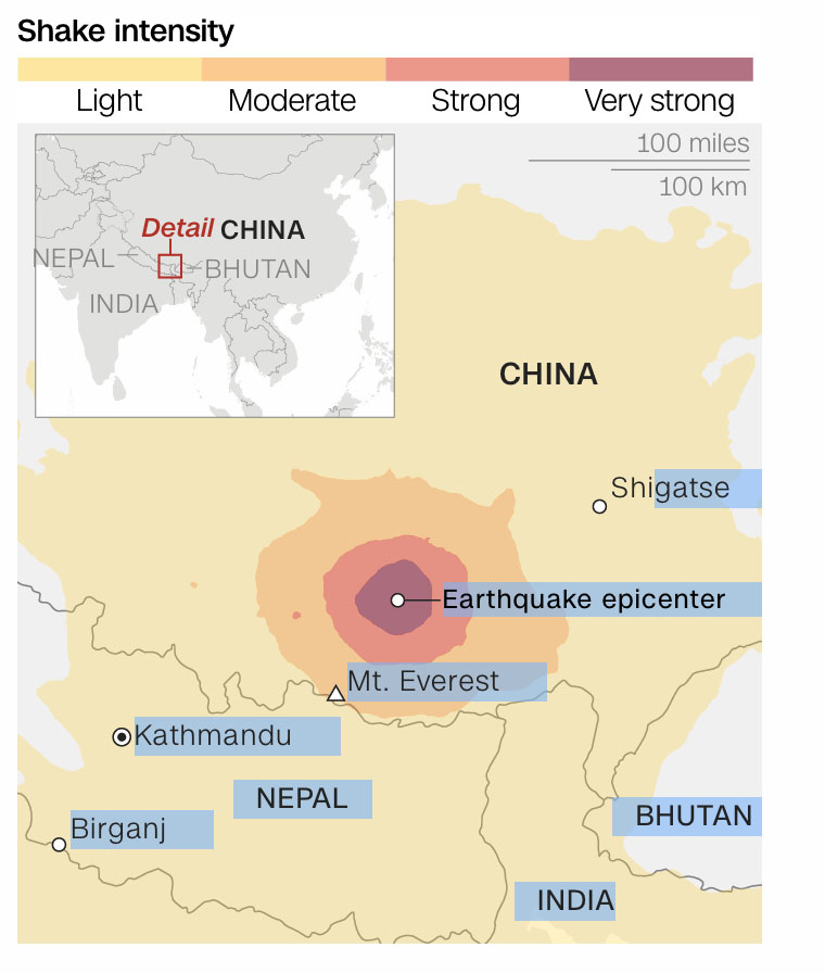 The earthquake also injured 13 people in Nepal and caused minor damage in northern India. Shaking was felt across South Asia. The earthquake was the largest in China since the Maduo earthquake in May 2021 and the deadliest since the Jishishan earthquake in December 2023. It was caused by normal faulting and originated within the continental crust at 10 km (6.2 mi) depth.