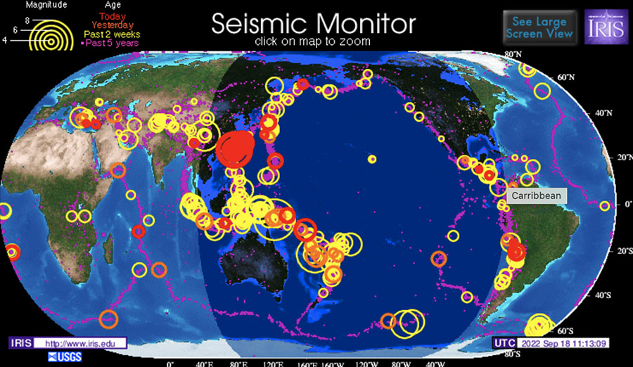 A new animation shows the shockwave from the 7.6 magnitude earthquake that struck Costa Rica this morning (Sept. 5) arriving and reverberating through the ground beneath the United States. The visualization was made by scientists at Incorporated Research Institutions for Seismology (IRIS) and shows the Earth slowly moving up and down. Red spots show seismometers moving upward; the darker the hue, the higher they are moving up. The opposite goes for blue. The visualization shows how earthquakes create waves of motion through the Earth's crust, just as a pebble tossed into a pond creates a ripple.