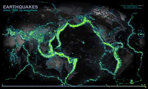 If you've ever wondered where - and why - earthquakes happen the most, look no further than a new map, which plots more than a century's worth of nearly every recorded earthquake strong enough to at least rattle the bookshelves. The map shows earthquakes of magnitude 4.0 or greater since 1898; each is marked in a lightning-bug hue that glows brighter with increasing magnitude.