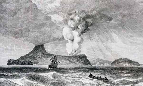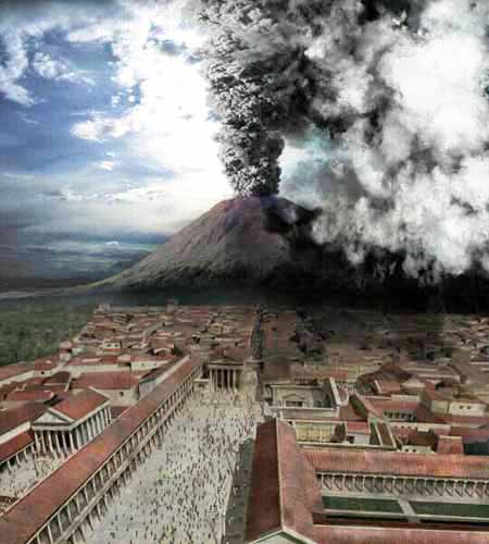 Mount Vesuvius erupts. The cities of Pompeii, Herculaneum, and Stabiae are buried in volcanic ash. Very fine ash particles remain high in the atmosphere for years, spreading around the world by high-altitude winds. This suspended material contributes to often spectacular sunsets, as well as an optical phenomenon known as Bishop's Ring.