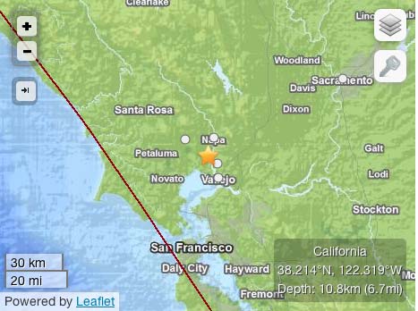 The 2014 Napa earthquake occurred in California, United States, at 10:20:44.00 UTC (3:20am local time) on August 24. The magnitude was measured 6.0 on the moment magnitude scale, and its epicenter was 3.7 miles (6.0 km) northwest of the city of American Canyon, near the West Napa fault. Significant damage was reported in the Napa area, sending at least 87 people to hospitals. More than 42,000 customers lost electric service. It was the largest earthquake to hit the San Francisco Bay Area in since the 1989 Loma Prieta earthquake 25 years earlier.