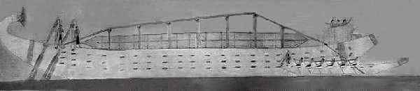 The 19th century print above shows an ancient Egyptian funeral barge facing another boat upon which priestesses are raising their hands (and voices) in lamentation. The boats of ancient Sumer, Babylon and Egypt were not made of wood, but bundles of tightly packed reeds. In the Mesopotamian region, a tall fresh water reed called berdi was used while in Egypt papyrus was the building material. Reeds were tied tightly together in bundles, narrowing towards the ends. The tightness of the lashings is critical in keeping water impregnation to a minimum. The bundles are lashed together with the ends then curling up in the traditional fashion for the papyrus ship. Bamboo or cane seems to have been the traditional material used for constructing the square cabins seen in many pictures and reliefs.