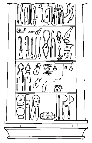 1) knives; (2) drill; (3) saw; (4) forceps or pincers; (5) censer; (6) hooks; (7) bags tied with string; (8, 10) beaked vessel; (11) vase with burning incense; (12) Horus eyes; (13) scales; (14) pot with flowers of Upper and Lower Egypt; (15) pot on pedestal; (16) graduated cubit or papyrus scroll without side knot (or a case holding reed scalpels); (17) shears; (18) spoons.