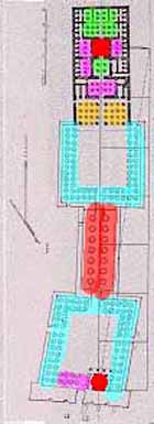 John Anthony West had told Irene and I that it is important to understand the geometry of Egypt. The Luxor Temple is a representation, not only of the abstract structures described above, but also of a human being. The South green-red-purple-gold area being Head, Neck, and Chest; The South blue area being the Arms surrounding the Stomach; The Central red area being the Pelvis, Thighs, and Knees; The North blue-red-purple area being the legs and feet. Perhaps the structure of the Luxor Temple might encode such things as Acupuncture Points and Chakras, with the South Chamber corresponding to the Third Eye. Everything is linked and created by the same patterns of Sacred Geometry.