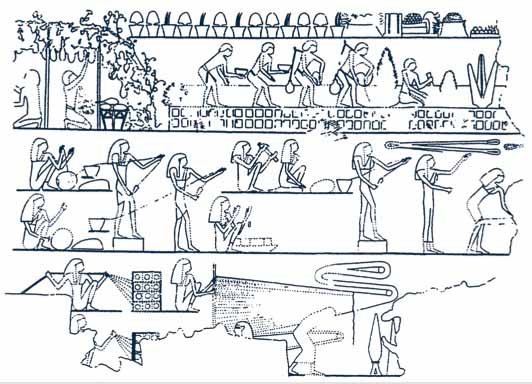 Ancient Egyptian depiction of women engaged in mechanical rope making, the first graphic evidence of the craft, shown in the two lower rows of the illustration.