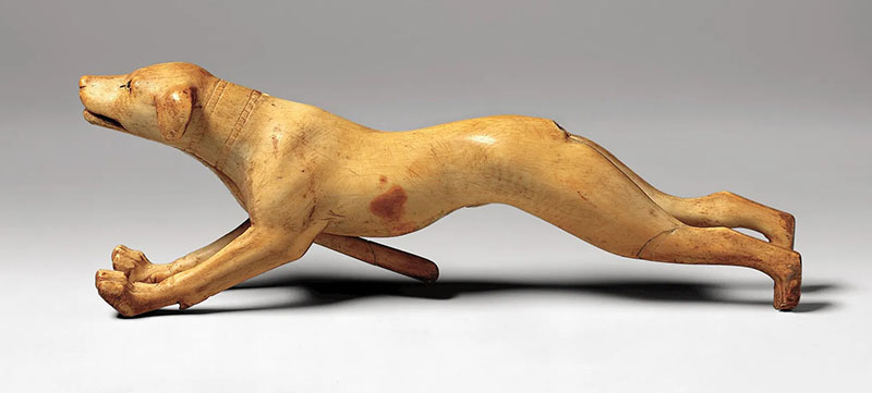 Posed as if leaping through the air, this carved ivory dog opens its mouth as a lever is pushed up and down, revealing two lower teeth and a red tongue. The dog, which was discovered in an ancient Egyptian tomb, is a reminder that these domesticated canines have been beloved pets for at least 3,400 years.