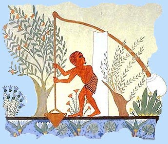 To lift the water from the canal they used a shaduf. A shaduf is a large pole balanced on a crossbeam, a rope and bucket on one end and a heavy counter weight at the other. By pulling the rope it lowered the bucket into the canal. The farmer then raised the bucket of water by pulling down on the weight. He then swung the pole around and emptied the bucket onto the field.
