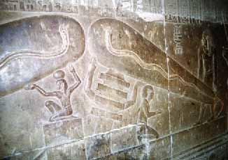 In his book The Eyes of the Sphinx, Erich Von Daniken writes that the relief is found in "a secret crypt" that "can be accessed only through a small opening. The room has a low ceiling. The air is stale and laced with the smell of dried urine from the guards who occasionally use it as a urinal." The room is not so secret, however, as many tourists visit and photograph the room every year. Von Daniken sees the snake as a filament, the djed pillar as an insulator, and claims "the monkey with the sharpened knives symbolizes the danger that awaits those who do not understand the device." This "device" is, the reader is assured, an ancient electric light bulb.