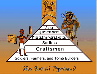 At the top of the social pyramid was the Pharaoh who was not simply a king and a ruler, but was considered a god on earth. The vizier was the pharaoh's closest advisor. Next came the high priests and noblemen whom the pharaoh appointed as his assistants, generals, and administrators, who together formed the government.