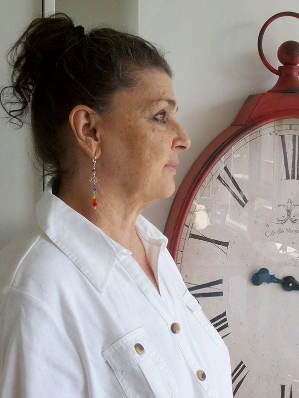 My friend Anna took this photo below in her apartment, which, like my apartment, faces the Verrazano Bridge. Though we were featuring the earrings, standing in front of the clock added meaning to our experience. The clock read 3:17, if that is significant for you. The earrings were a gift from a Crystalinks reader named Tracey in Washington State. She designed them based on the chakras, referencing my file.