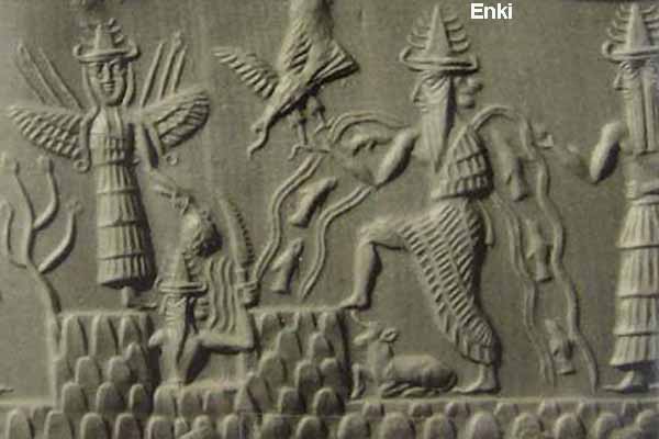 In Sumerian mythology, Eridu was the home of the Abzu temple of the god Enki, the Sumerian counterpart of the Akkadian water-god Ea. Like all the Sumerian and Babylonian gods, Enki/Ea began as a local god, who came to share, according to the later cosmology, with Anu and Enlil, the rule of the cosmos. His kingdom was the waters that surrounded the world and lay below it (Sumerian ab=water; zu=far).