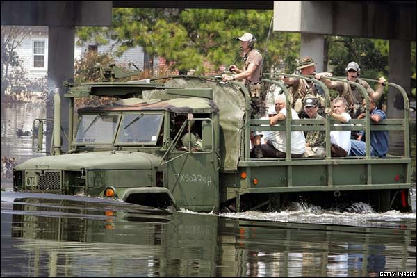 Along the way another gentlemen, Refugee, pulled his truck along side of us and told usual to get in. So we did. He took us to the final staging area. Once at the final staging area there was an immediate feeling of 'whoa.' Here there were thousands of people and buses upon buses, helicopters circling the grounds, National Guard surrounding the perimeters. It was a huge standstill, nothing was happening. We walked for hours among the people of our city, when a medic approached us and asked us if we were okay. My husband informed him that I was pregnant and had to walk through the floodwaters.