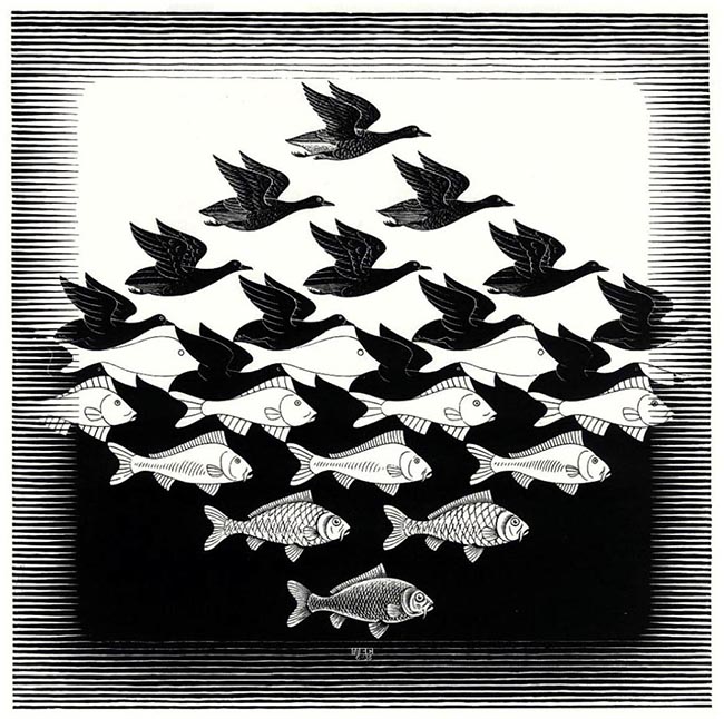 Sky and Water, in which light plays on shadow to morph fish in water into birds in the sky....