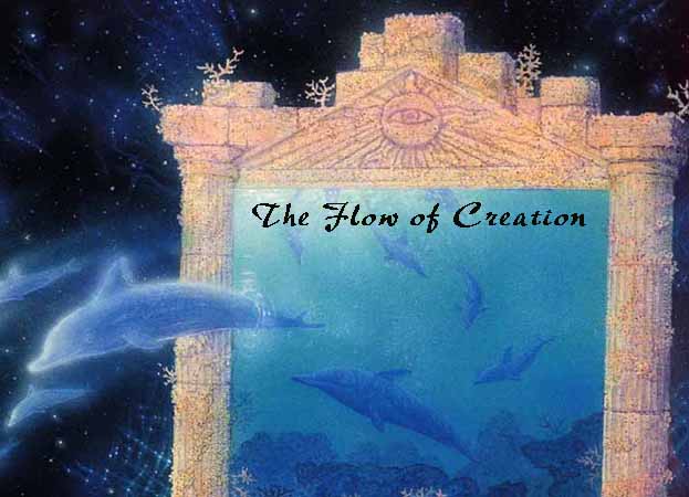 A friendly dolphin beckons you to pass through the pyramid of creation, the center of which is a circle (ovum) and a sphere (sperm)- the 'all seeing eye' - creational geometry.