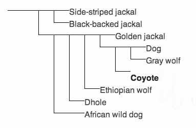The earliest fossil carnivores that can be linked with some certainty to canids are the Eocene Miacids, which lived some 38 to 56 million years ago. The Miacids later diverged into caniforms and feliforms, with the former line leading to such genera as the coyote-sized Mesocyon of the Oligocene (38 to 24 million years ago), the fox-like Leptocyon and the wolf-like Tomarctus which inhabited North America some 10 million years ago. The coyote represents a more primitive form of Canis than the gray wolf, as shown by its relatively small size and its comparatively narrow skull and jaws, which lack the grasping power necessary to hold the large prey wolves specialize in. This is further corroborated by the coyote's sagittal crest, which is low or totally flattened, thus indicating a weaker bite than the wolf's. The coyote is not a specialized carnivore as the wolf is, as shown by the larger chewing surfaces on the molars, reflecting the species' relative dependence on vegetable matter. In these respects, the coyote resembles the fox-like progenitors of the genus more so than the wolf. Modern phylogenetics places the coyote between the gray wolf and golden jackal.