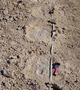 The aquatic creature left its "footprints" as two parallel rows of small dots, each about 2 millimeters in diameter. Scientists said today that the animal must have stepped lightly onto the soft marine sediment, because its legs only pressed shallow pinpoints into that long-ago sea bed.