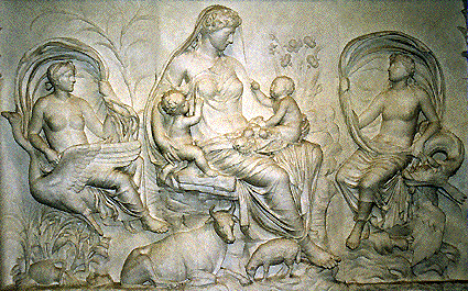 In the theory of Hesiod, Gaia was the first being, who appeared out of the chaos together with Tartaros (underworld), Nyx (night), Erebos (darkness) und Eros (ghost of love). Without the help of a man she created her sons Uranos (heaven) and Pontos (ocean). She fused with her son Uranos and bore the titans, Kronos Rhea, also Okeanos and Tethis, gods of the great stream, which is winding around the earth. Furthermore the Kyklops and the giants with a hundred amrs. But her man and son Uranos hated these creatures so much that he pushed them back into the womb before they were born, which caused Gaia bad harm. Angry about her tyrannical man Gaia gave a sickle made from firestone to her son Kronos and ordered him to unman his father the next opportunity which was given. Kronos did what hsi mother had told him and throw detached genitals far along the sea. Out of the falling blood drops appeared the Erinnyias (furies), the giants, and also the Meliai (nymphs of the ashen). The phallus prowled on the sea and finally arrived at Paphos (Cypern) - or on the island Kythera/Lakonia. Out of the foam which was formed on the phallus the love-goddess Aphrodite came to being.