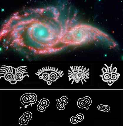 The explanatory power of plasma discharge becomes even more interesting when one begins to consider new evidence that our early ancestors witnessed strikingly similar high-energy plasma discharge in the terrestrial sky. The rock art images above are from North America (first row) and Easter Island (second row). Innumerable counterparts occur around the world - all presenting a common pattern that would seem to mock natural experience: disembodied, often 'hairy' eyes presented in a consistently non-human form. The pictures are not random, either in their geographic positioning, or in their depictions of detail. And in almost every instance they sit alongside equally enigmatic carvings of other well-defined motifs, all chronicled through cross cultural comparison, and now posing a grand mystery yet to be unraveled by rock art specialists. When seen from a larger perspective, three independent lines of evidence - galactic structure, plasma experiments, and images carved on stone - converge to tell the same story.