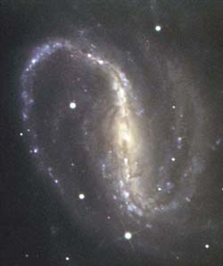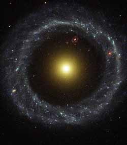 Ring Galaxies have a ring-like appearance. The ring consists of massive, relatively young blue stars, which are extremely bright.