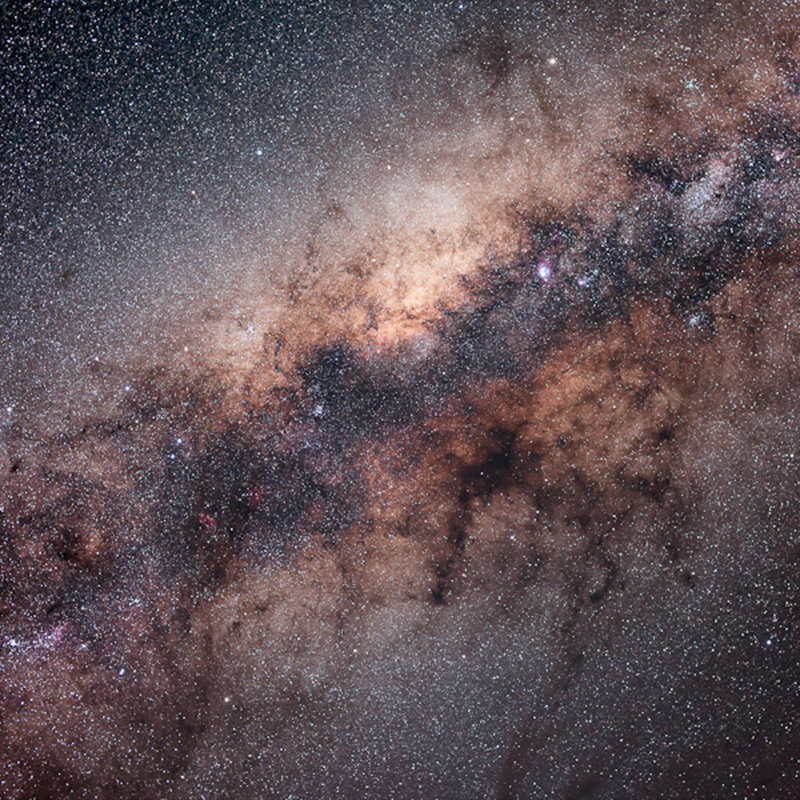 A view of the night sky near Sagittarius, enhanced to show better contrast and