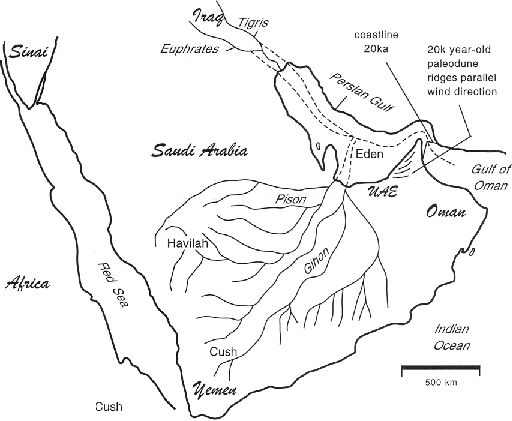 The coast line of this land mass was considerably elevated, and the neck connecting with the mainland was only twenty-seven miles wide at the narrowest point. The great river that watered the Garden came down from the higher lands of the peninsula and flowed east through the peninsular neck to the mainland and thence across the lowlands of Mesopotamia to the sea beyond. It was fed by four tributaries which took origin in the coastal hills of the Edenic peninsula, and these are the "four heads" of the river which "went out of Eden," and which later became confused with the branches of the rivers surrounding the second garden.