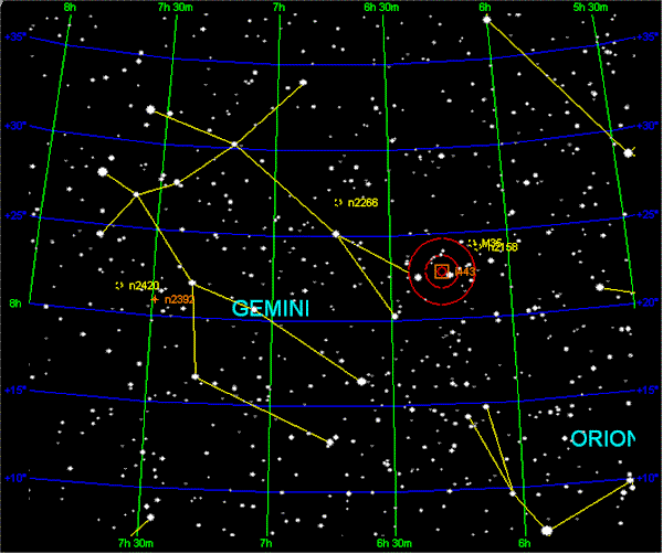 Gemini lies between Taurus to the west and Cancer to the east, with Auriga and Lynx to the north and Monoceros and Canis Minor to the south.