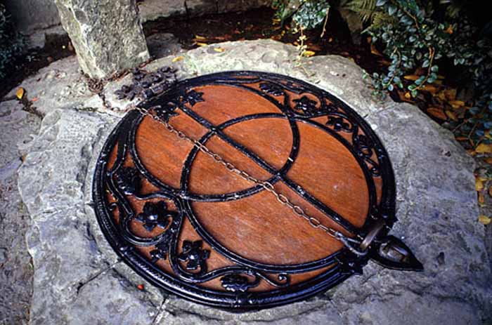 Wells often feature in Welsh and Irish mythology as gateways to the spirit world. The overlapping of the inner and outer worlds is represented by the well cover, designed by the church architect and archaeologist Frederick Bligh Bond and presented as a gift after the Great War in 1919. The two interlocking circles constitute the symbol known as the Vesica Piscis. In the well lid design, a spear or a sword bisects these two circles, a possible reference to Excalibur, the sword of the legendary King Arthur, believed by some to be buried at the nearby Glastonbury Abbey. Foliage represents the Glastonbury Holy Thorn.