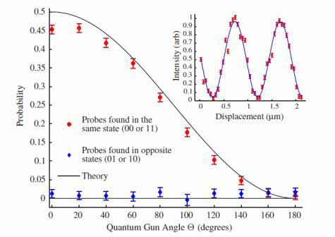 This graph shows that, as the accuracy of the quantum gun increases (from 0 to 180 degrees) so that it is more likely to flip a qubitÕs state, the probability of successful self-consistent teleportation (red dots) decreases. While the theoretical probability of teleportation of qubits in opposite states is zero, the experimental probability of qubits in opposite states (blue diamonds) is about 0.01.