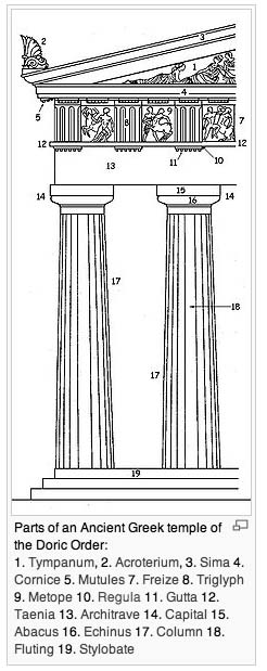 The Doric order is recognized by its capital, of which the echinus is like a circular cushion rising from the top of the column to the square abacus on which stress the lintels. The echinus appears flat and splayed in early examples, deeper and with greater curve in later, more refined examples, and smaller and straight-sided in Hellenistc examples. A refinement of the Doric Column is the entasis, a gentle convex swelling to the profile of the column, which prevents an optical illusion of concavity.