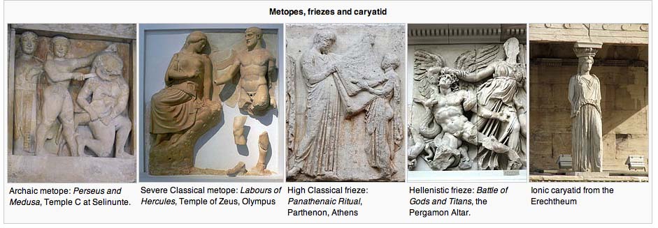 In the three orders of Ancient Greek architecture, the sculptural decoration, be it a simple half round astragal, a frieze of stylized foliage or the ornate sculpture of the pediment, is all essential to the architecture of which it is a part. In the Doric order, there is no variation in its placement. Reliefs never decorate walls in an arbitrary way. The sculpture is always located in several predetermined areas, the metopes and the pediment.