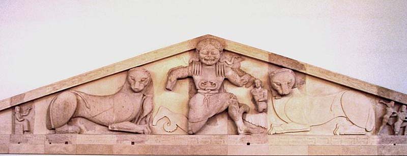 Architectural sculpture showed a development from early Archaic examples through Severe Classical, High Classical, Late Classical and Hellenistic. Remnants of the Archaic architectural sculpture (700 - 500 BC) exist from the early 6th century BC with the earliest surviving pedimental sculpture being remnants of a Gorgon flanked by heraldic panthers from the centre of the pediment of the Artemis Temple of Corfu.