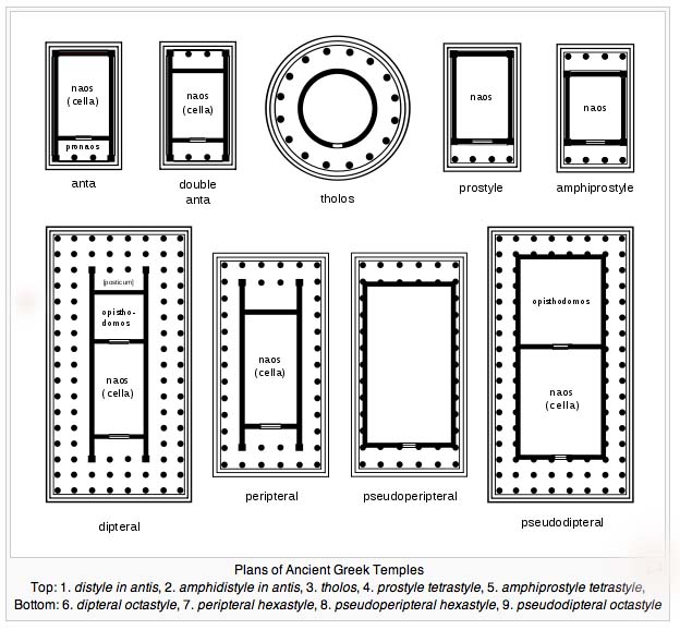 On the stylobate, often completely surrounding the naos, stood rows of columns. Each temple was defined as being of a particular type, with two terms: one describing the number of columns across the entrance front, and the other defining their distribution.