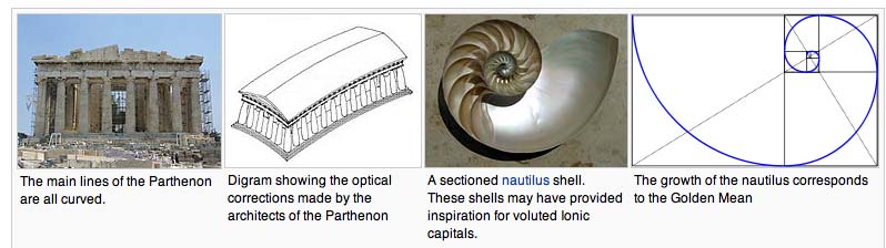 The ideal of proportion that was used by Ancient Greek architects in designing temples was not a simple mathematical progression using a square module. The math involved a more complex geometrical progression, the so-called Golden mean. The ratio is similar to that of the growth patterns of many spiral forms that occur in nature such as rams' horns, nautilus shells, fern fronds, and vine tendrils and which were a source of decorative motifs employed by Ancient Greek architects as particularly in evidence in the volutes of capitals of the Ionic and Corinthian Orders.