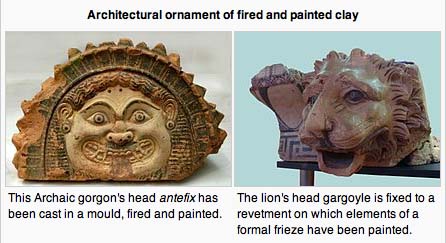 The clay ornaments were limited to the roof of buildings, decorating the cornice, the corners and surmounting the pediment. At the corners of pediments they were called acroteria and along the sides of the building, antefixes. Early decorative elements were generally semi-circular, but later of roughly triangular shape with moulded ornament, often palmate. Ionic cornices were often set with a row of lion's masks, with open mouths that ejected rainwater. From the Late Classical period, acroteria were sometimes sculptured figures.