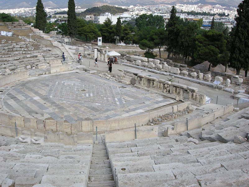 Every Greek town had an open-air theatre. These were used for both public meetings as well as dramatic performances. The theatre was usually set in a hillside outside the town, and had rows of tiered seating set in a semicircle around the central performance area, the orchestra. Behind the orchestra was a low building called the skn, which served as a store-room, a dressing-room, and also as a backdrop to the action taking place in the orchestra. A number of Greek theatres survive almost intact, the best known being at Epidaurus, by the architect Polykleitos the Younger.
