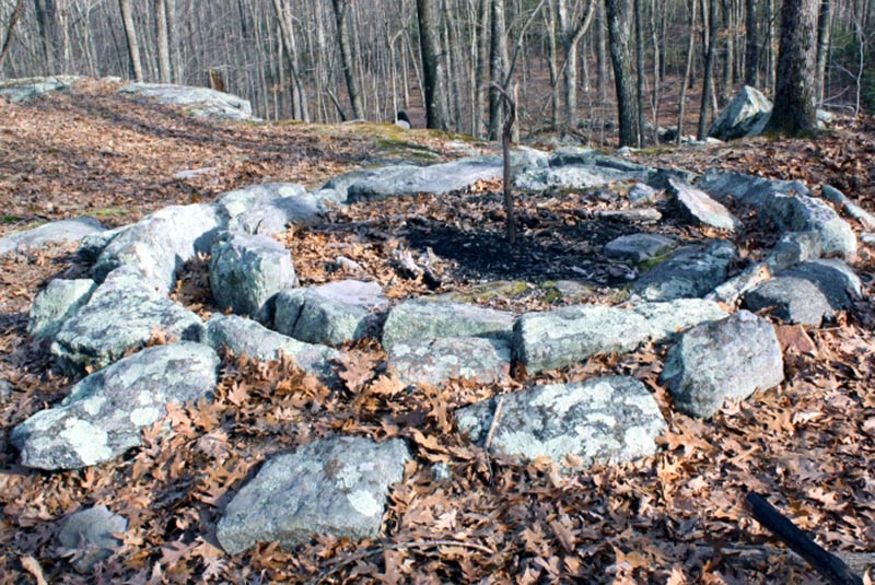 Besides containing beehive chambers and petroglyphs, the Gungywamp site has a double circle of stones near its center, just north of two stone chambers. Two concentric circles of large quarried stones - 21 large slabs laid end to end are at the center of the site.