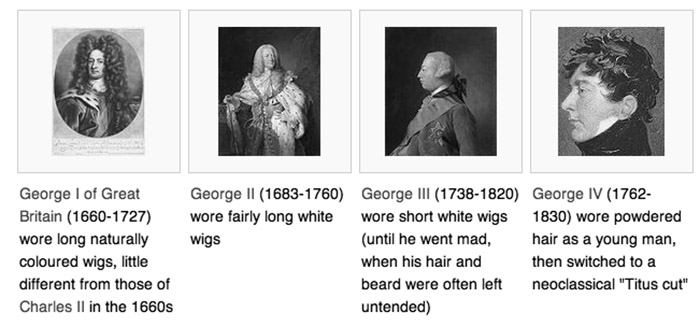 Late 17th-century wigs were very long and wavy, but became shorter in the mid-18th century, by which time they were normally white (George II). A very common style had a single stiff curl running round the head at the end of the hair. By the late 18th-century the natural hair was often powdered to achieve the impression of a short wig, tied into a small tail or "queue" behind (George III).